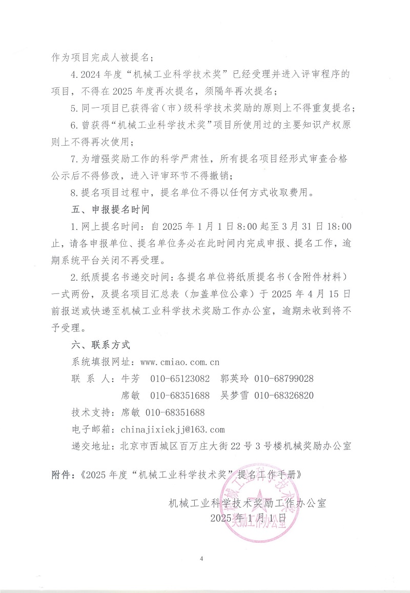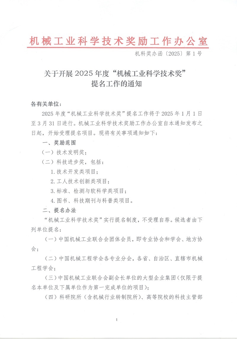 2025年度"機械工業科學技術獎"提名工作將于2025年1月1日至3月31日進行,機械工業科學技術獎勵工作辦公室自本通知發布之日起,開始受理提名項目。